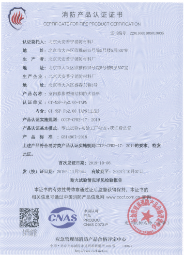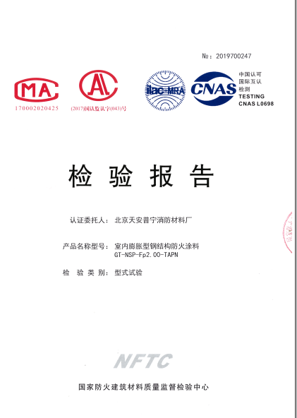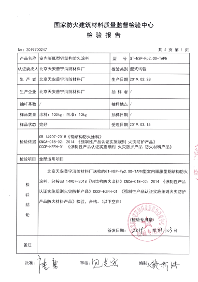 ![]() GT-NSP-TAPN 室內(nèi)膨脹型鋼結(jié)構(gòu)防火涂料經(jīng)《國家固定滅火系統(tǒng)和耐火構(gòu)件質(zhì)量監(jiān)督檢驗中心》按GB14907-2018《鋼結(jié)構(gòu)防火涂料通用技術(shù)條件》標準檢驗,理化性能合格,耐火極限最高可達2h。該涂料具有附著力強,耐久性長,涂層薄、耐火極限高、易施工等優(yōu)點。涂層遇火迅速膨脹,涂層形成海綿狀較厚實的防火隔熱層,使鋼結(jié)構(gòu)遇到火災(zāi)時不易變彎曲和坍塌,延長鋼結(jié)構(gòu)耐火時間達到防火效果。 產(chǎn)品組成: 應(yīng)用范圍:可適用于建筑工程中各種鋼構(gòu)件、球形網(wǎng)架等承重結(jié)構(gòu)的防火保護 施工工藝: 鋼結(jié)構(gòu)表面應(yīng)徹底除銹,涂刷防銹漆兩遍,表面清潔無油污; 該涂料適用于噴涂施工,涂層表面呈均勻的凹凸不平顆粒狀; 將涂料攪拌均勻,第一遍涂層厚度不能超過1.2mm,涂層表干后(約6小時)進行第二遍噴涂,涂層厚度可以適量的加大,涂層厚度達到和耐火時間相對應(yīng)的厚度為止,1h的一遍,1.5h的二遍,2h的三遍,2.5h的三遍; 施工中感覺涂料稠化時,可加入適量水稀釋,禁止多加,以免影響涂料的附著力和防火性能; 施工操作應(yīng)在室內(nèi)通風條件良好的環(huán)境下進行,施工避免雨淋,施工環(huán)境0℃以上; 涂料開啟后應(yīng)當天用完,若未使用干凈,必須封閉完好后保存。 耐火性能: