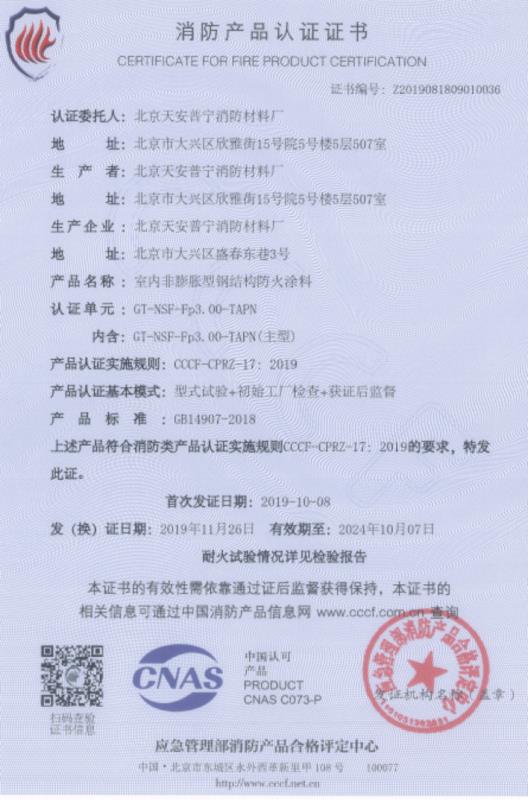 ![]() GT-NSF-TAPN室內(nèi)厚型鋼結(jié)構(gòu)防火涂料是我廠開(kāi)發(fā)出的最新產(chǎn)品,它取代了以前厚型鋼結(jié)構(gòu)防火涂料雙組份的施工工藝,使施工工藝變得更加簡(jiǎn)單易行,而且附著力強(qiáng),耐火隔熱性能好,33mm的涂層厚度耐火極限可以達(dá)到3個(gè)小時(shí)。 產(chǎn)品組成: 膨脹蛭石、高強(qiáng)度粘結(jié)劑、阻燃纖維、耐高溫材料、隔熱材料助干劑等復(fù)合原料制作而成,不含石棉、甲醛及苯類(lèi)等揮發(fā)性有害物質(zhì)。 應(yīng)用范圍:可適用于建筑工程中鋼結(jié)構(gòu)構(gòu)件的防火保護(hù) 施工工藝: 鋼結(jié)構(gòu)表面應(yīng)徹底除銹,涂刷防銹漆兩遍,表面清潔無(wú)塵土、無(wú)油污; 在施工現(xiàn)場(chǎng)先將涂料和水按(1:1.5)的比例充分?jǐn)嚢杈鶆?,最好使用電?dòng)攪拌器加以攪拌; 注意:為了涂料內(nèi)的各種材料更好的分散溶解,需要等待三十分鐘再攪拌一次然后進(jìn)行噴涂; 該涂料的施工方法為噴涂法; 第一遍涂層厚度不能超過(guò)5mm,待第一遍涂層表干后再進(jìn)行第二遍噴涂,涂層厚度可以適量加大,一般噴4-5遍可達(dá)到25mm; 注意:配比攪拌均勻好的涂料應(yīng)在12小時(shí)內(nèi)使用完畢; 當(dāng)天氣溫低于0℃時(shí),風(fēng)力大于5級(jí)時(shí)不得施工; 施工應(yīng)在通風(fēng)良好的室內(nèi)進(jìn)行,當(dāng)在室外施工時(shí)遇有雨天氣時(shí)不能施工。 耐火性能: 涂層厚度25 mm,耐火極限不低于3小時(shí),每平方米用量約為10公斤 包裝、貯存及運(yùn)輸: 包裝為紡織袋,每袋凈重25公斤,運(yùn)輸和存放要注意防潮,有效期為六個(gè)月。